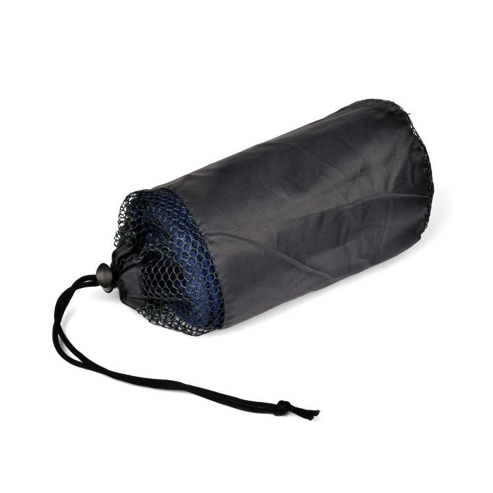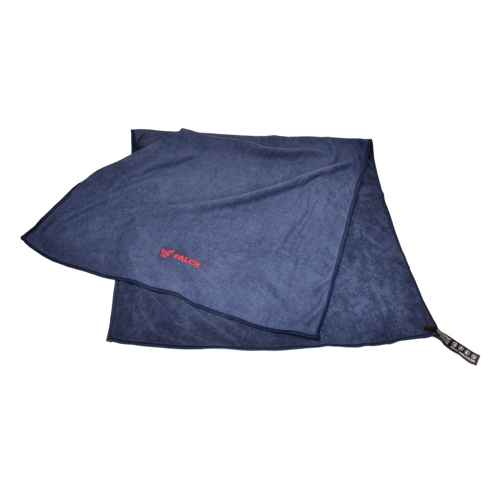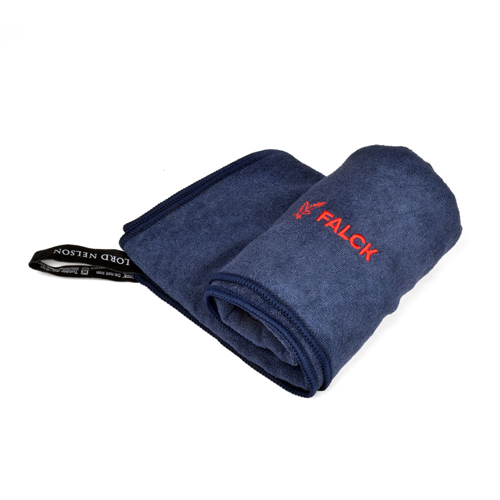 Mikrofiber håndklæde, der ikke krøller, fylder lidt, tørrer hurtigt og kommer i en pæn lille pose. Falck logo som broderi.